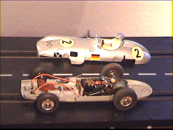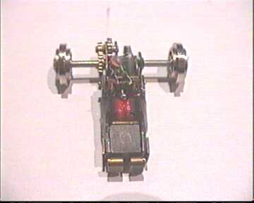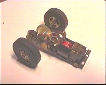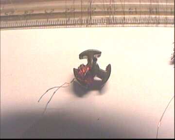 | Nun konnte es endlich ans Neuwickeln gehen. Aber wie - ohne konkrete Daten ? Mein erster Versuch war, die bewährte Doppelwicklung wie bei dem großen Motor aufzubringen. Es war möglich, 240(!) Windungen aufzubringen, wobei die dritte Wicklung platzmäßig ein echtes Problem war, aber schließlich hat es geklappt (Bilder 1 und 2). Die Ernüchterung folgte sofort , als ich versuchte, den Anker in den Motor einzubauen - die Wicklungen waren einfach zu dick, alle drei schliffen am hinteren Lagerblech :-( . Beim Versuch ein paar Windungen runterzuwickeln, riß der Draht - ich hatte die Wicklungen ja aus guter Erfahrung heraus mit Lack fixiert. Also alles nochmal runter und auf ein Neues. Diesmal habe ich immer mal probiert, ob der Anker noch ins Gehäuse paßt und so war die Grenze bereits bei 190 Windungen erreicht - ob das reichen würde ? Ich baute den Motor zusammen und stellte nach einem Test mit der 9V Batterie zu meiner Freude fest, das der Motor ganz gut lief. Also steckte ich ihn ins Getriebe und das Ganze wurde in meinem Mercedes Monoposto implantiert. Schon beim ersten Start fiel mir auf, daß der Motor nach viel Strom verlangte - ich mußte den Regler fast ganz reindrücken um das Auto auf Geschwindigkeit zu bringen. Nach einem kurzen Rennen merkte ich dann auch, daß der Motor sehr heiß wurde und nach einer längeren Fahrt fing der Renner tatsächlich an stilecht zu qualmen - die Hitze war dem Lack wohl zuviel geworden. | |||||
