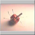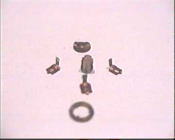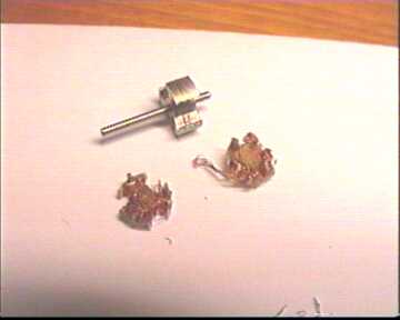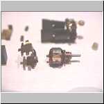 | Der kleine Motor läßt sich zerlegen, indem man an dem hinteren Halteblech vorsichtig die Nasen aufbiegt. Dann kann man die Seitenteile etwas auseinanderspreizen und das Blech herausnehmen. Nachdem das Ritzel entfern ist, kann man den Anker nach hinten herausziehen. Der Anker ist übrigens wesentlich kleiner als der des 45700 .Wenn man möchte, kann man die Seitenteile nun leicht vom vorderen Lagerblech nebst Kohlen lösen, indem man die Haltenasen des Blechs nur ganz leicht aufbiegt. Ich habe dann versucht, eine Wicklung vom Anker abzuwickeln. Leider stellte sich das als absolut unmöglich heraus - der Draht mit seinem Lack und irgendwelche, zu diesem Zeitpunkt nicht genau zu erkennende Kunststoffteile, hatten sich wohl durch Hitzeeinwirkung untrennbar miteinander verbunden. Die einzige Möglichkeit, das auseinanderzubekommen, war die Wicklungen komplett zu durchtrennen (Bild 5) :-( . Dadurch war es natürlich nicht möglich, die Windungen zu zählen oder gar im Nachhinein den Widerstand einer Wicklung zu bestimmen. | |||||